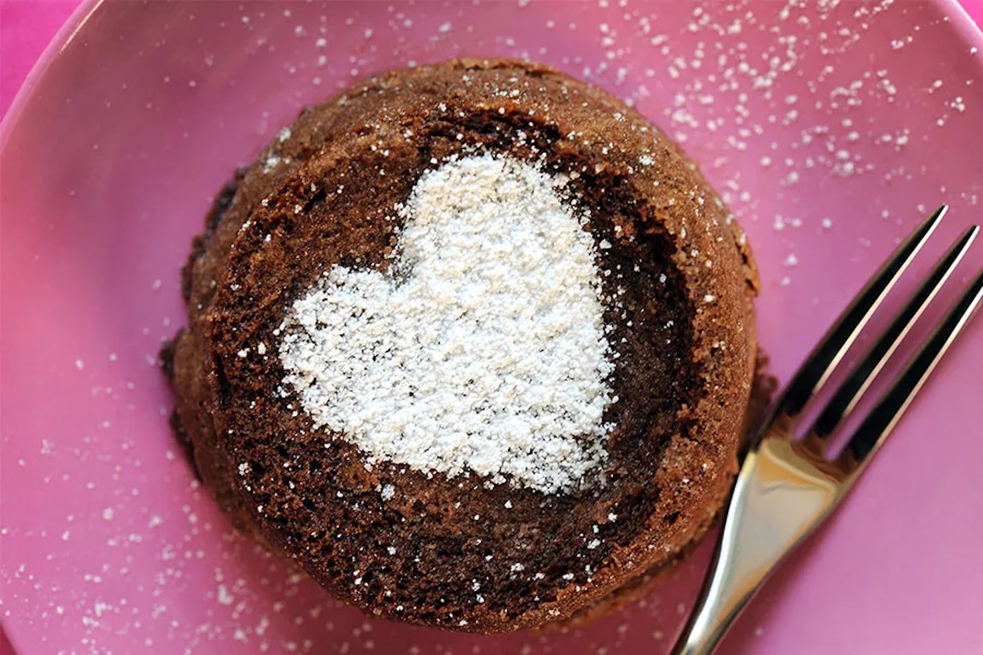 - Place a heart-shaped stencil over each cake and sift powdered sugar on top before serving.
