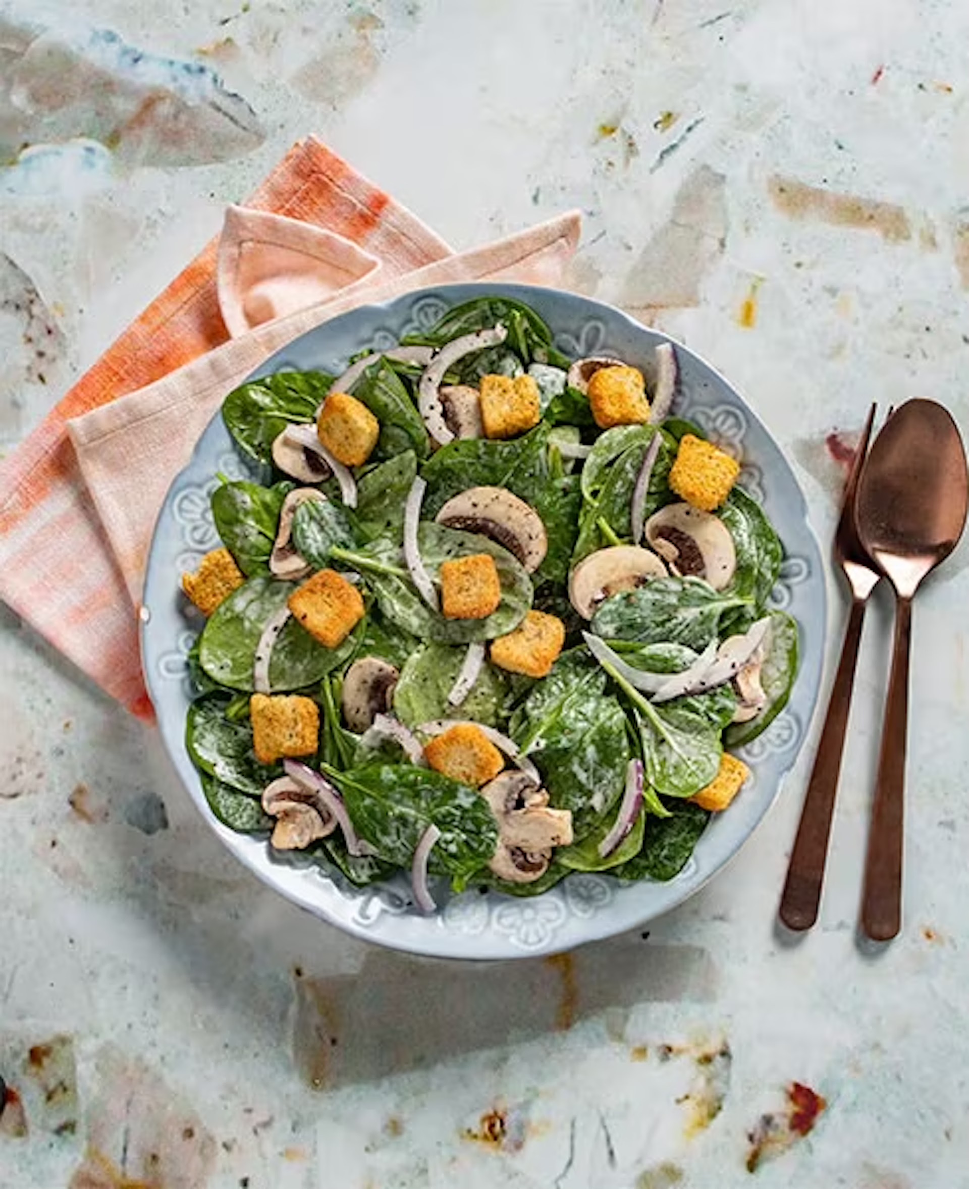 - Toss spinach, red onion and mushrooms in serving bowl.