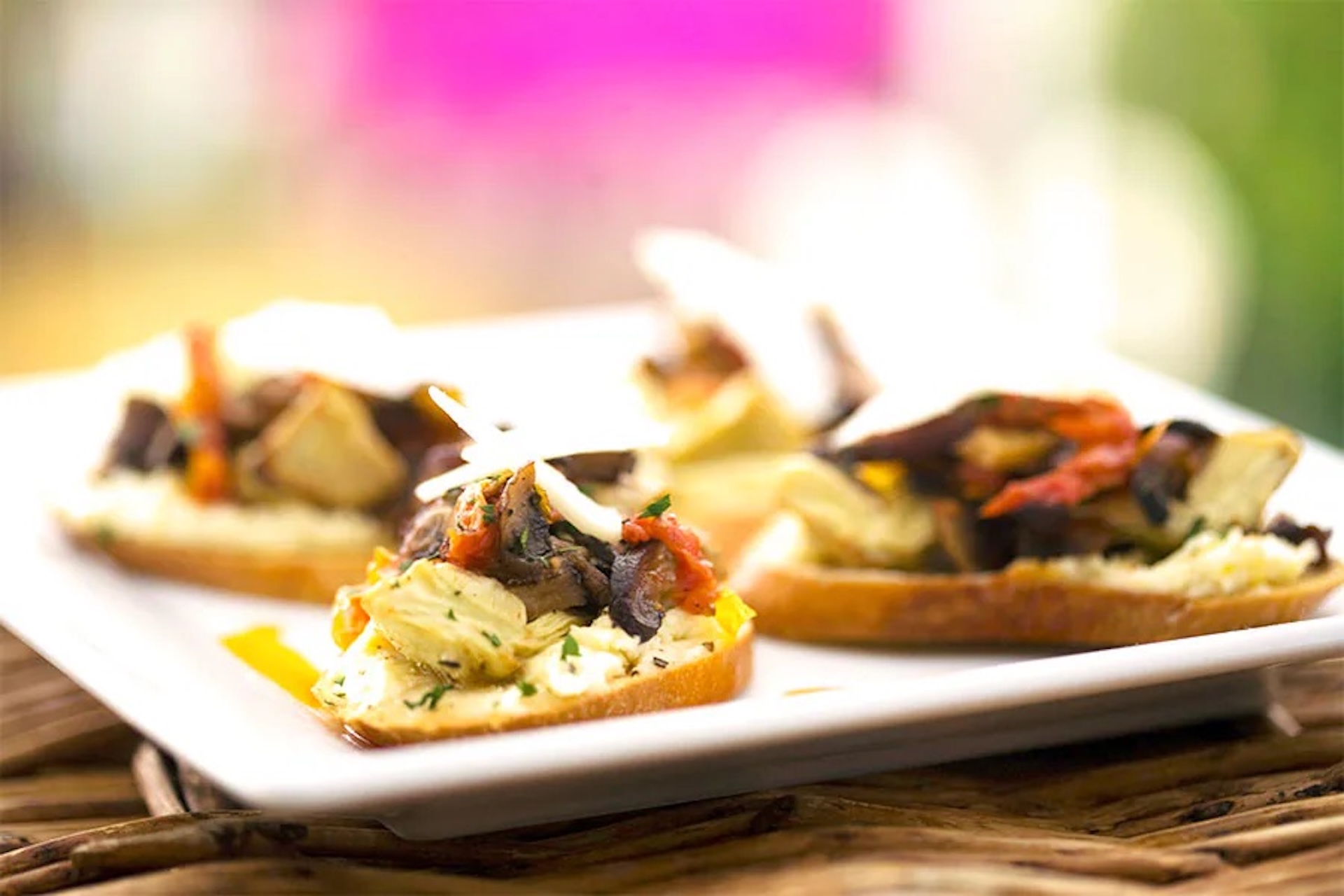 This flavorful Rustic Bruschetta graced the menu for many years at Wine Country Trattoria at Disney California Adventure park. To save time on Valentine’s Day, the mushroom and artichoke topping for this bruschetta can be made up to two days in advance and reheated before serving. This recipe serves 6-8 as an appetizer but will serve two people as a main course.