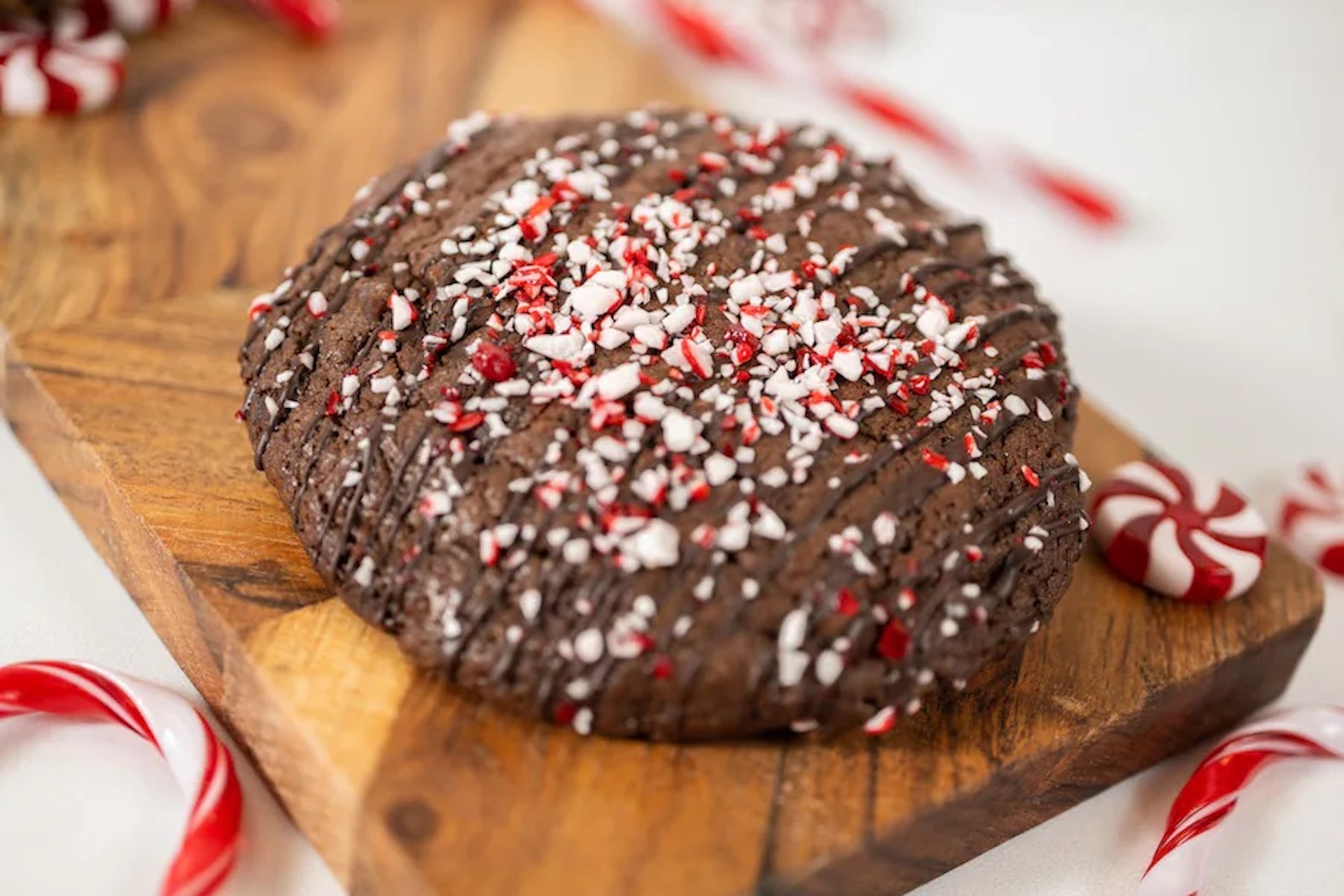 - Using a fork, drizzle melted chocolate over cookies and sprinkle crushed candy canes on top.
