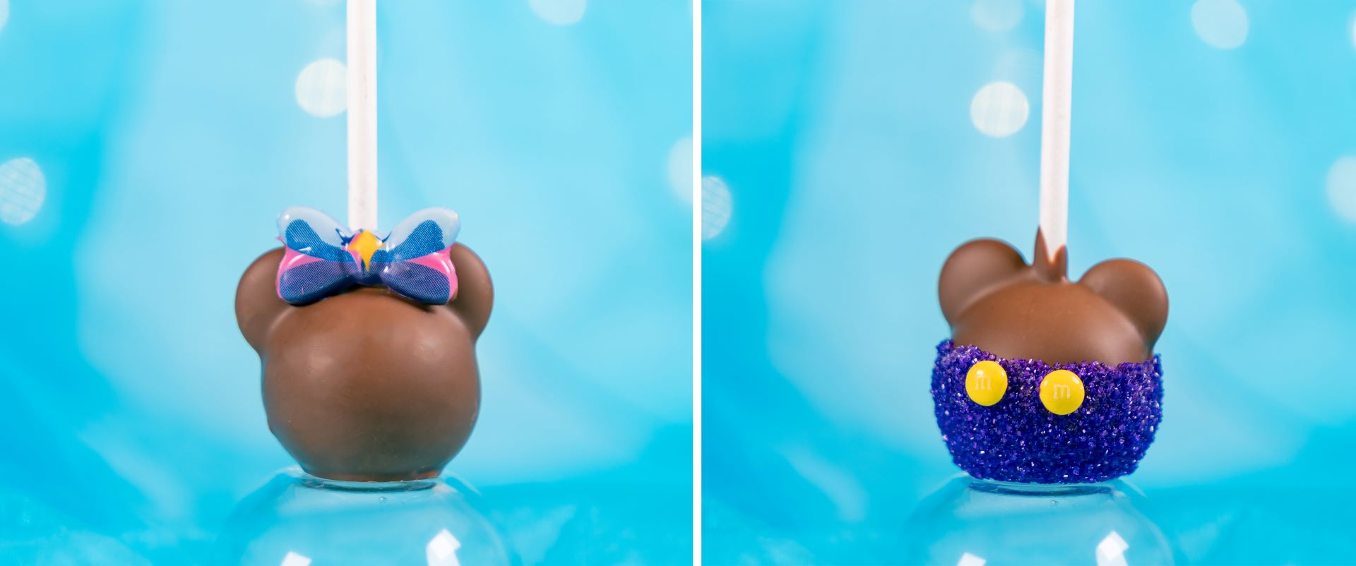 - 70th Minnie Caramel Apple: Granny Smith apple with marshmallow ears dipped in caramel and milk chocolate and decorated with a lavendar sugar dress, teal M&M’S Milk Chocolate Candies, and a 70th Celebration Minnie chocolate bow (New)