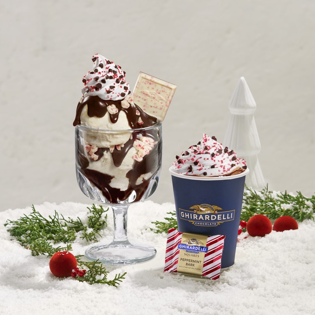 • Peppermint Bark Hot Fudge Sundae: Vanilla ice cream layered with handmade hot fudge and peppermint chunks topped with whipped cream, festive red sugar, mini dark chocolate chips, and a Peppermint Bark SQUARE
